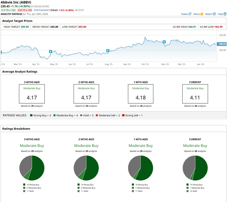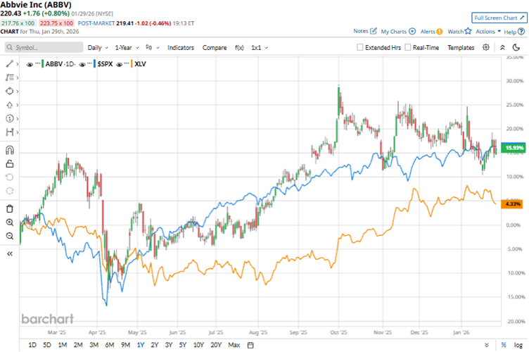 Strong sales from immunology blockbusters Skyrizi and Rinvoq offset Humira’s patent cliff decline. Growth in neuroscience and a diversified portfolio fueled revenue in 2025. Over the past 52 weeks, AbbVie’s stock has gained 25.8%, while over the past six months, it has risen 15.3%. The company’s shares reached a 52-week high of $244.81 in October 2025, but are down 10% from that level.